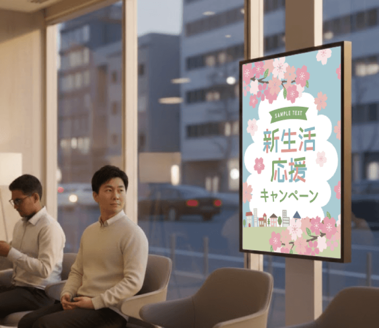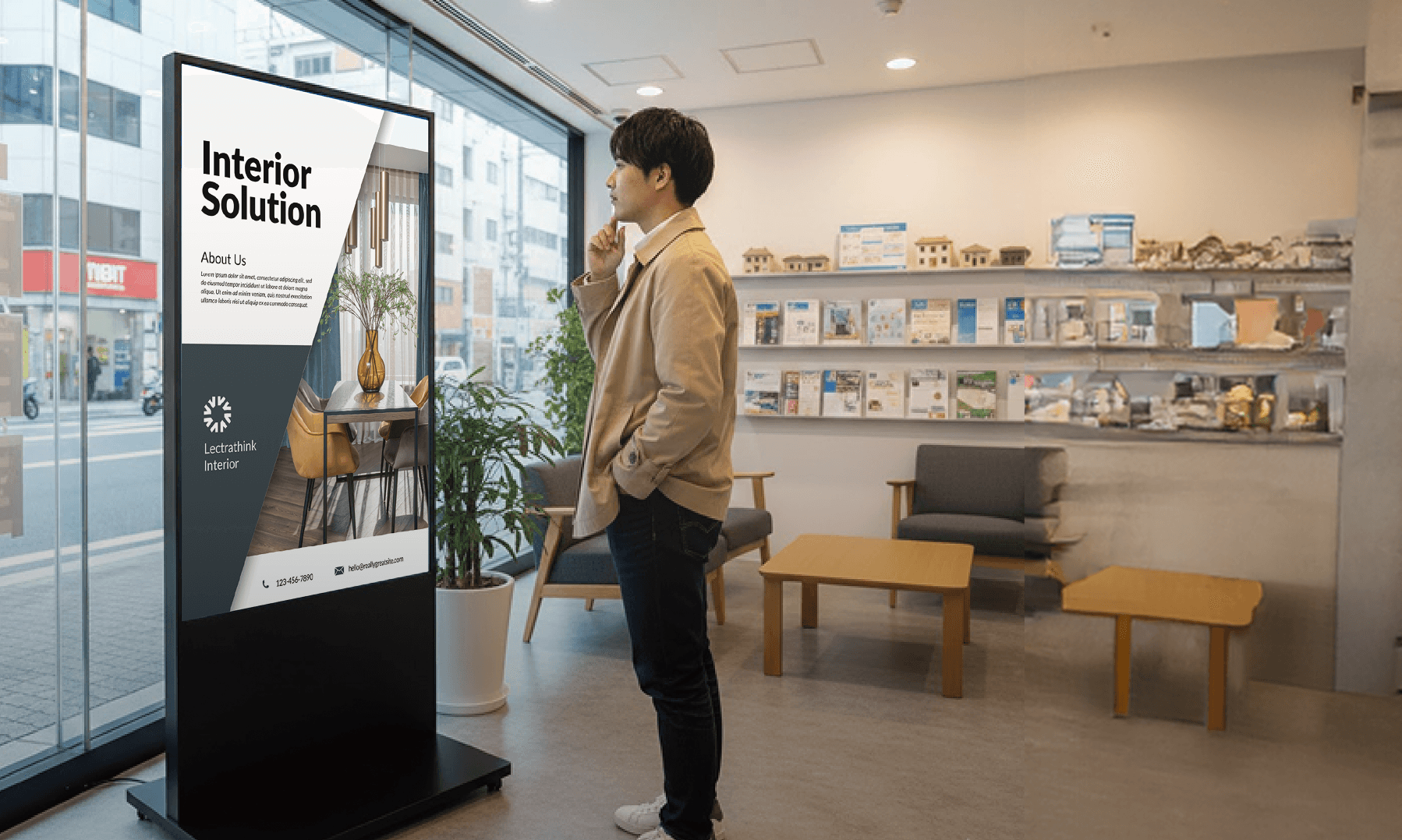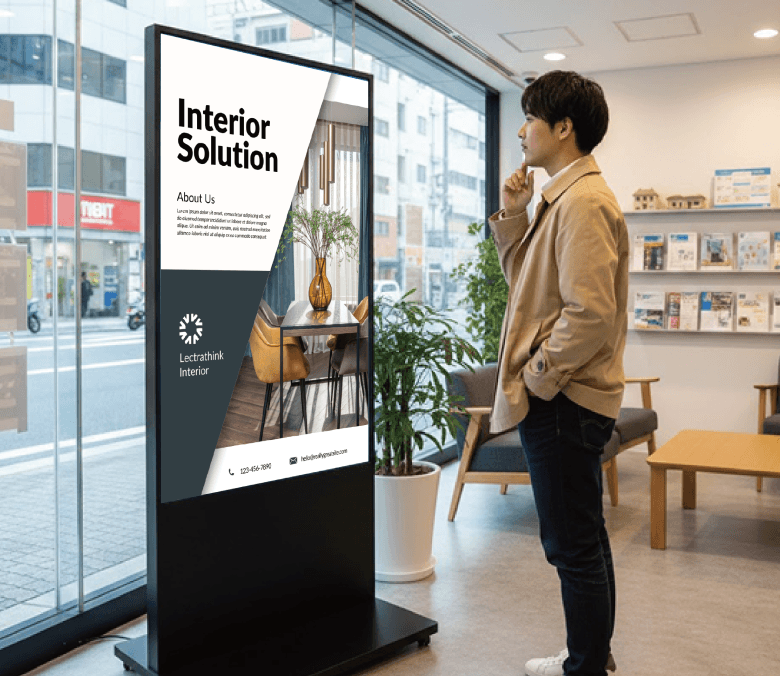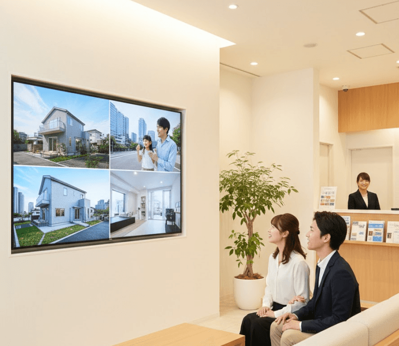 不動産店舗での手続き中には、自然と待ち時間が発生し、来店者の視線は店内の画面に向かいます。